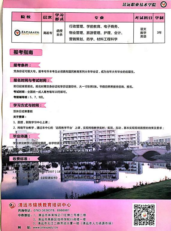 共青團(tuán)清遠(yuǎn)市委員會(huì)2017年圓夢計(jì)劃正式啟動(dòng)!【北京大學(xué)圓夢計(jì)劃,圓你大學(xué)夢】成人本科:北京大學(xué)(網(wǎng)絡(luò)教育)符合條件者3年共交學(xué)費(fèi)2000元,專科:清遠(yuǎn)職業(yè)技術(shù)學(xué)院(成人函授),符合條件者3年共交學(xué)費(fèi)1000元,就能完成學(xué)業(yè),輕松拿證!另外,企業(yè)人力資源管理師職業(yè)資格考證、叉車上崗證考證等現(xiàn)火熱接受報(bào)名中,歡迎有志提升自己的朋友咨詢報(bào)名。咨詢熱線:成老師0763-3630112 15816286696微信同步 報(bào)名地址:清遠(yuǎn)市北江二路勞動(dòng)大廈一樓