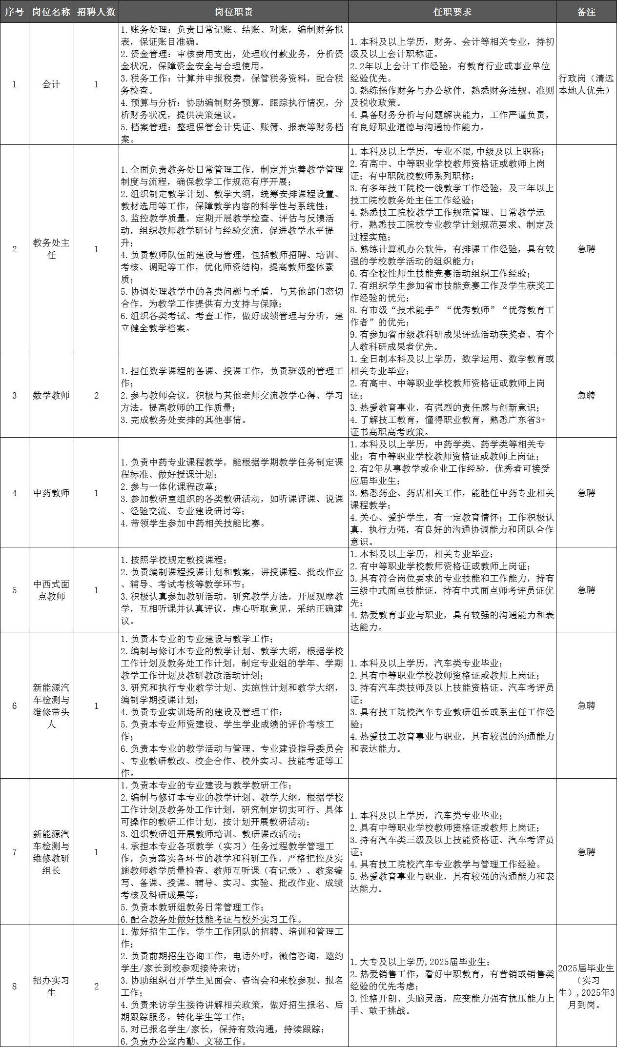 清遠(yuǎn)市南方技工學(xué)校2025年上半年教職工招聘崗位 - 20250302更新.xlsx