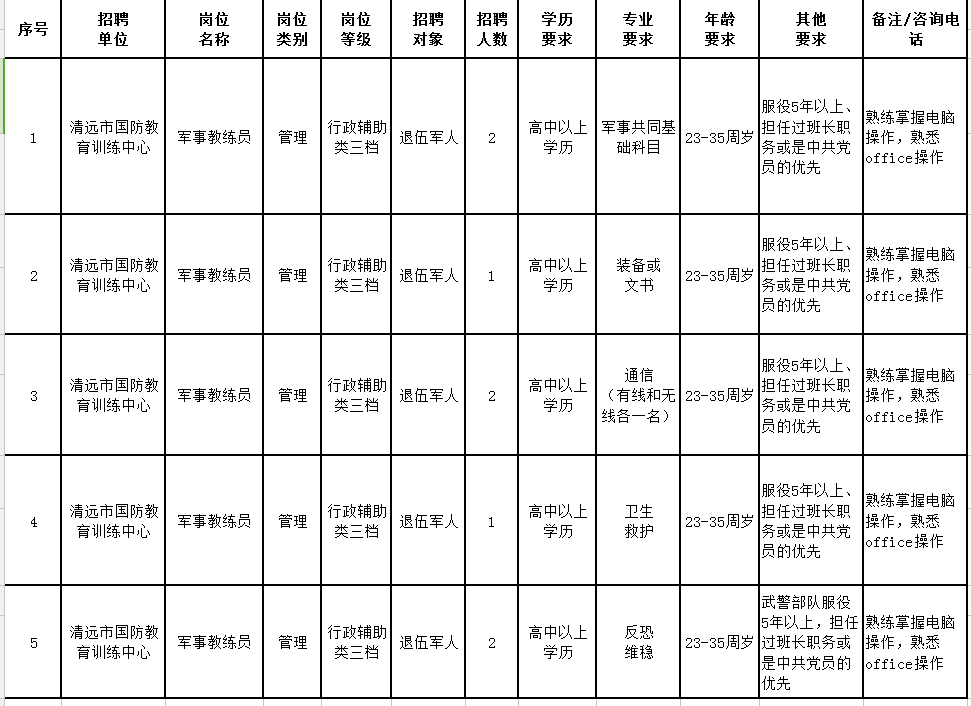 根據(jù)清遠(yuǎn)市國防訓(xùn)練中心工作需要,按照公平、公開、公正、擇優(yōu)的原則,我中心面向社會公開招聘8名工作人員(軍事訓(xùn)練教官,非政府雇員,非行政事業(yè)編制人員,不列入用人單位編制序列,不擔(dān)任行政職務(wù)),現(xiàn)將有關(guān)事項(xiàng)公告如下: