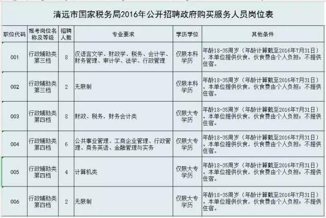 具體招聘職位和人數(shù)見《清遠(yuǎn)市國(guó)家稅務(wù)局2016年公開招聘政府購買服務(wù)人員崗位表》(附件1)。