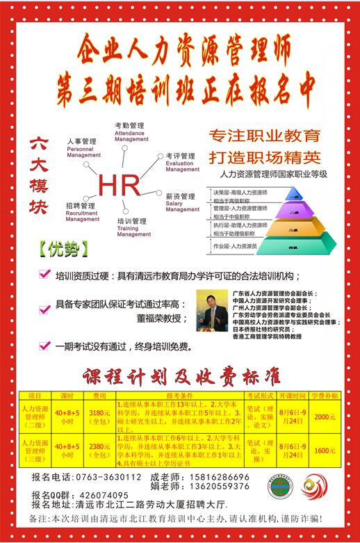 企業(yè)人力資源管理師第三期培訓(xùn)班正式開始報名,歡迎各位有意向了解或者想考的小伙伴到勞動大廈一樓現(xiàn)場咨詢。本次培訓(xùn)由清遠市北江教育培訓(xùn)中心主辦,請認準(zhǔn)機構(gòu),謹防受騙。